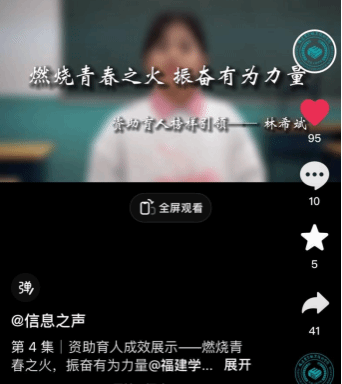 在生活上,她能够独立自强,积极参加各种社会实践活动和志愿者活动,累计时长111.16小时。暑期加入“寻脉传统,赋能杨源”乡村振兴实践团,走入乡村去体验不一样的风土人情,通过对传统技艺的学习,了解体验国家级非物质文化遗产“四平戏”。完成1部“我们是产品推荐官”视频,1部“燃烧青春之火,振奋有为力量”资助育人榜样引领视频,在学院信息之声抖音平台发布,共收获1w浏览量,希望可以通过自己的力量来感染更多人勇敢去追求,才会拥有无限的可能。