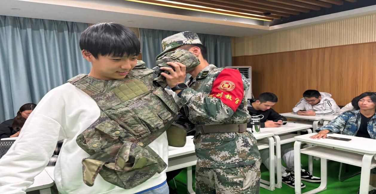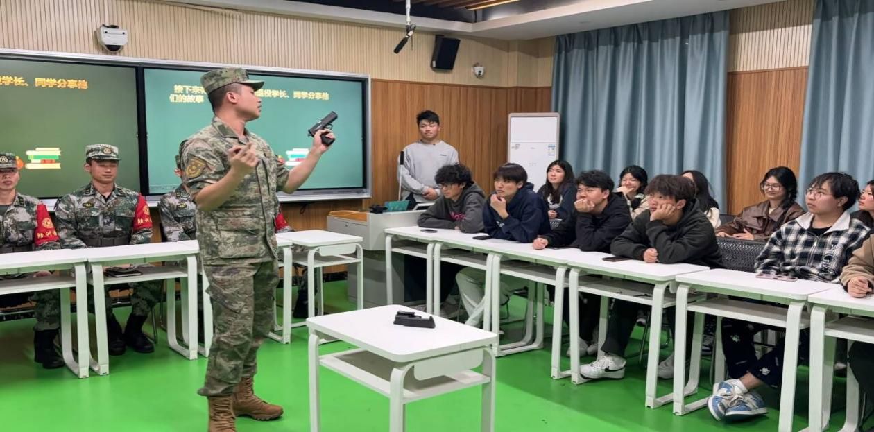 班会伊始,班长向同学们介绍了本次班会的主题和目的,并邀请带训教官上台与大家见面。随后,环境2206班许勤睿同志作为退伍大学生代表特别参与班会并做专题分享,现场展示了单兵弹袋的装戴、手枪(模拟)拆卸和使用,并以亲切的话语和幽默的风格,分享了自己在军队中的成长经历以及作为一名退伍大学生对未来的规划,引起班级全体同学的热烈共鸣。班长林大烨作为退伍大学生在班会中发言,他认为军训不仅是为了锻炼同学们的身体素质,更是为了培养大家的纪律意识、团队协作能力和面对困难时坚韧不拔的精神。