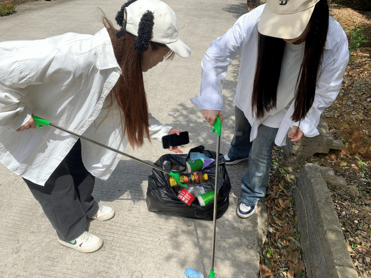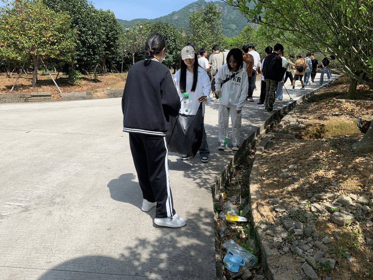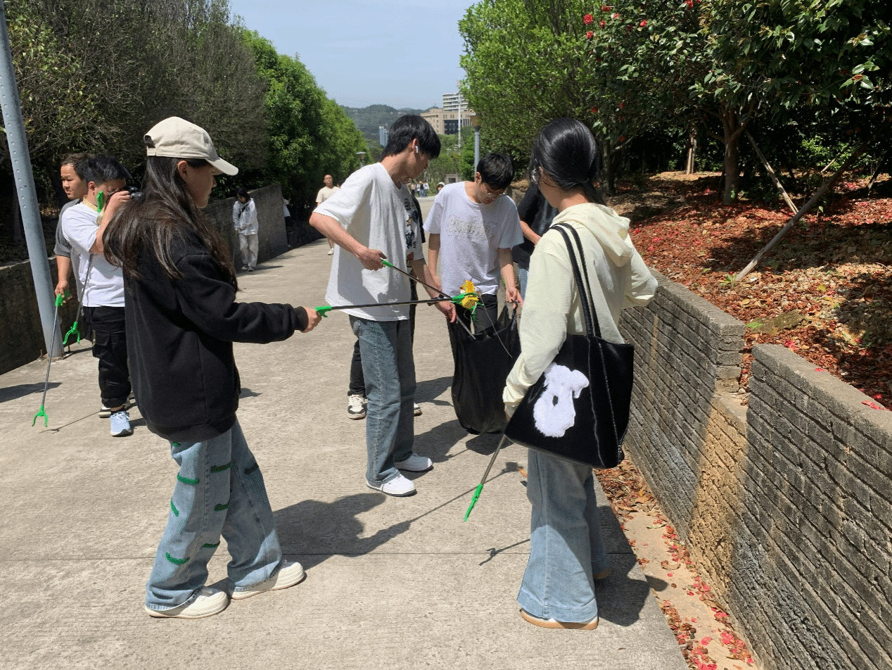 晴空万里无云,连阳光都格外“慷慨”,把每片叶子的脉络都照得纤毫毕现。全班同学分组开展校园清洁志愿行动,大家手持拾物钳、垃圾袋,对耕读南路、林荫大道等地进行“地毯式”清理。同学们分工明确、配合有序,更有同学自发向路过的师生宣传环保理念,呼吁共同守护校园环境。班长洪俊涵在劳动中说到“捡起一片垃圾,就是捡起一份责任。”希望用实际行动带动更多人参与环保。
