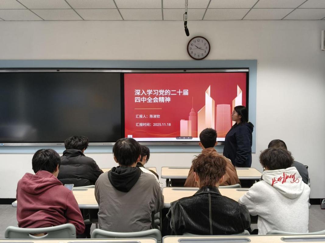 本次活动由团支书围绕党的二十届四中全会召开背景、主要内容、工作部署及目标任务等方面展开系统讲解,帮助团员全面把握全会提出的新发展理念、现代化建设路径及高质量发展要求。在学习交流环节,团员青年围绕“坚持党的全面领导”“统筹发展与安全”“推动科技自立自强”等议题展开热烈讨论。通过交流,团员们进一步认识到要将个人成长融入国家发展大局,以创新实干服务现代化建设,增强紧迫感和使命感。