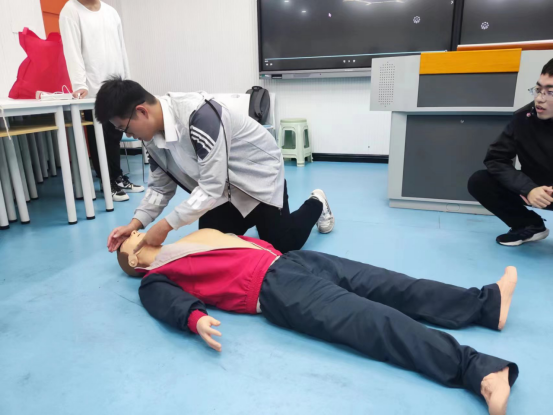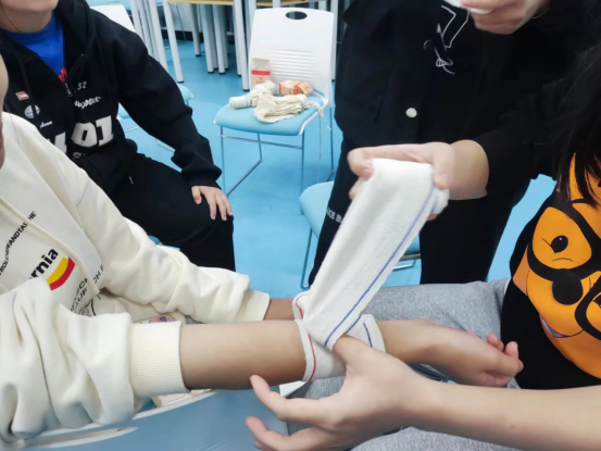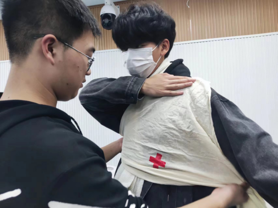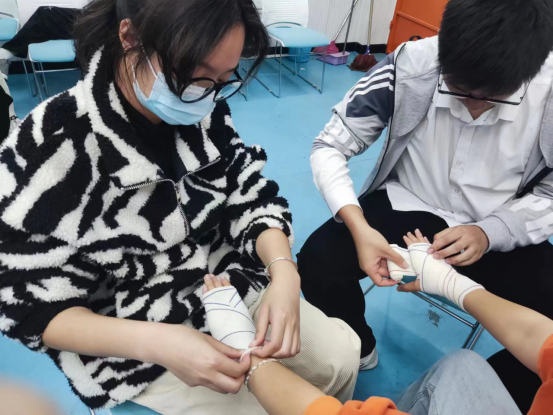 此次急救培训活动,采用理论知识教学、视频讲解与实际演示操作相结合的方式进行,组长们仔细讲解急救知识和注意事项,细心指导同学们进行现场演练。同学们饱含热情,认真聆听讲解的急救知识内容,并积极动手练习对身体不同受伤部位的不同包扎手法,例如心肺复苏基本流程、单胸包扎法、八字包扎法等,把理论知识在实践中转化成储备知识,提升自己的日常防护技能。