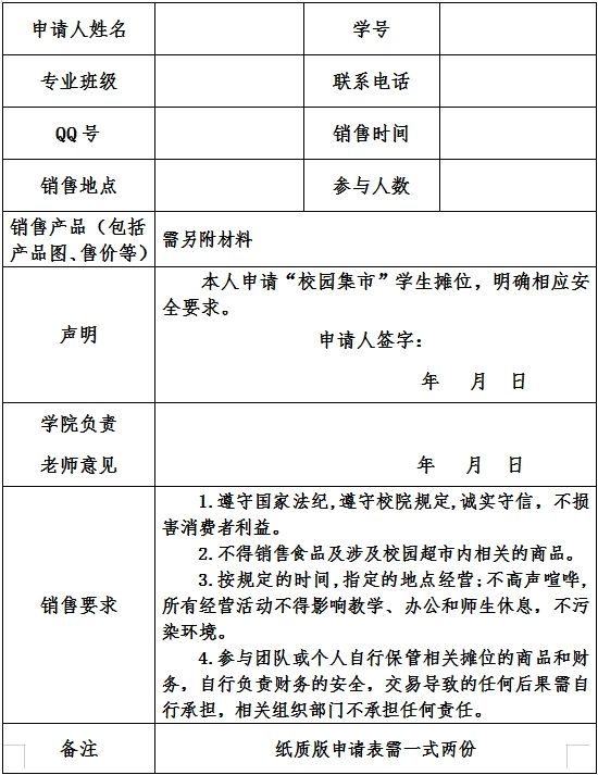 1.本次活动以个人或团队形式报名(团队报名人员不得超过三人),并填写好申报表(附件一)发送至邮箱:3566393838@qq.com,申报表命名格式为摊主姓名+班级+联系方式。