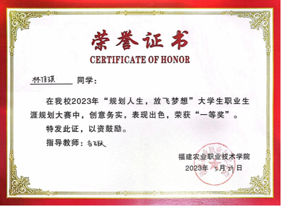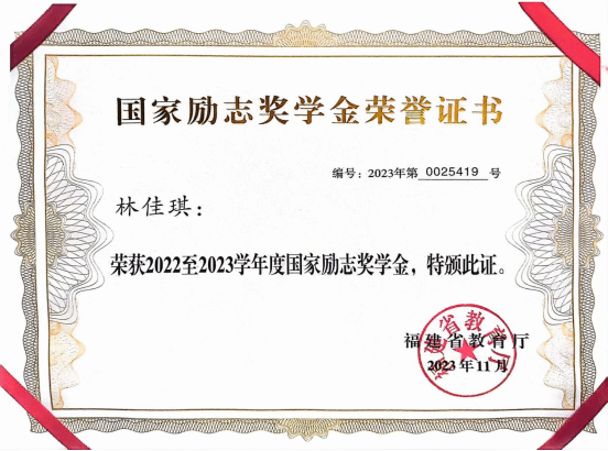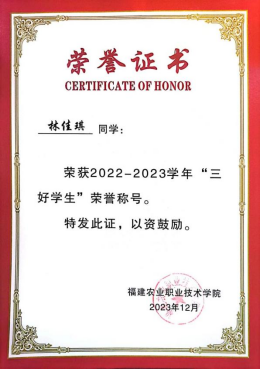 该生勤学善思,成绩优异,乐于奉献,履职尽责。在2022—2023学年中学习成绩排名第六,综合测评排名第一,荣获“国家励志奖学金”、bat365在线登录网站注册赠送36“规划人生,放飞梦想”大学生职业生涯规划大赛“一等奖”等三十余项荣誉。