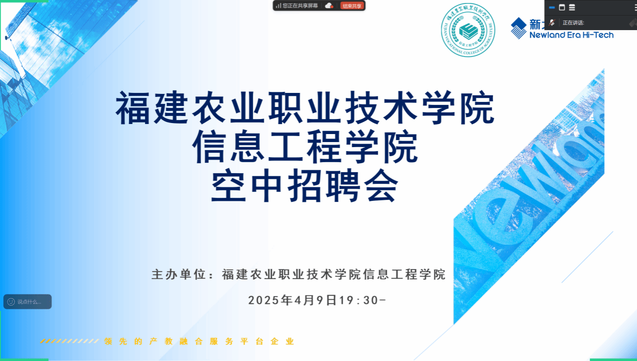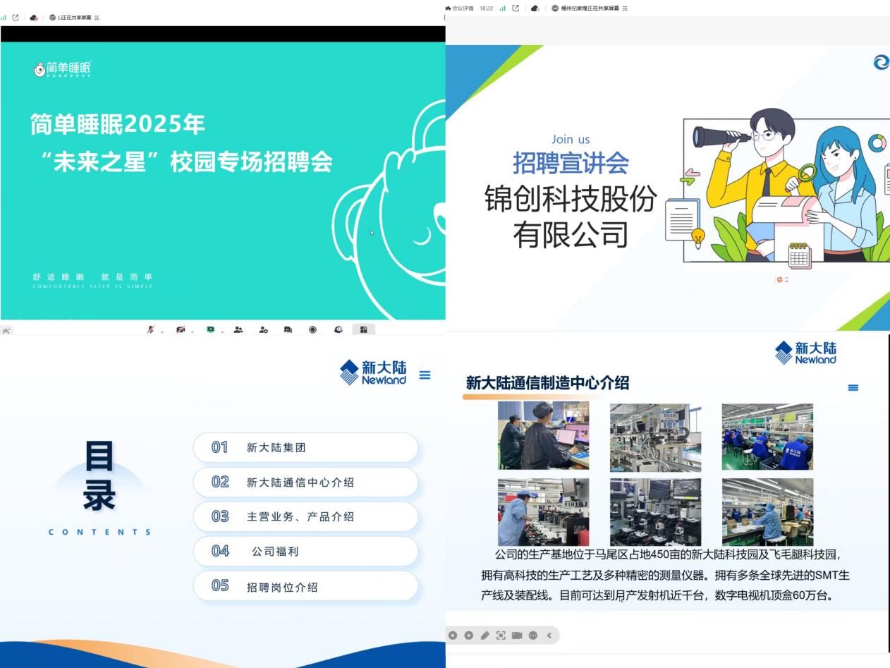 为做好2025届毕业生就业工作,搭建毕业生与用人单位双向交流平台,拓宽学生就业渠道,我院于4月9日成功举办了一场别开生面的线上招聘会。此次招聘会吸引了锦创科技股份有限公司福州分公司、上海简睡家居用品有限公司、福建新大陆通信科技股份有限公司等多家知名企业踊跃参与,为毕业生们提供了众多契合专业方向的优质就业岗位。