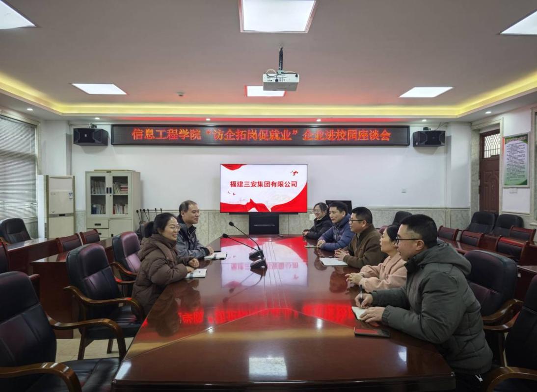 为深入推进校企合作,精准对接产业人才需求,拓展毕业生高质量就业渠道,1月23日,福建三安集团有限公司走进bat365在线登录网站注册赠送36信息工程学院,共同举办“访企拓岗促就业”专题座谈会。会议在学院407会议室举行,由信息工程学院承办。学院党总支书记陈云德、副书记赵楠、副院长吴瑾,福建三安集团有限公司人力资源中心副总经理李榕龙、人资专员欧阳,以及毕业班辅导员代表共同参会。