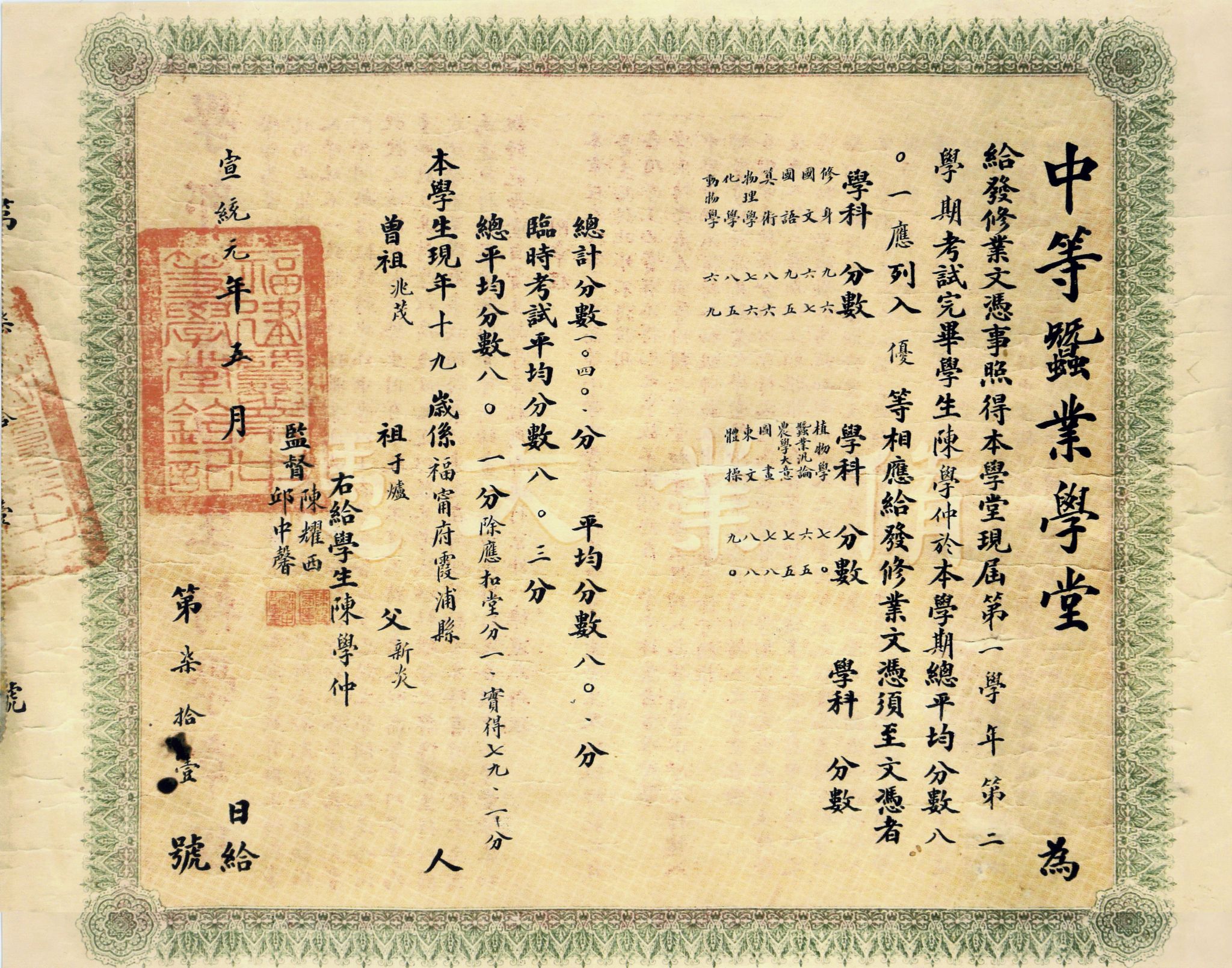 宣统元年(1909)中等蚕业学堂毕业证书