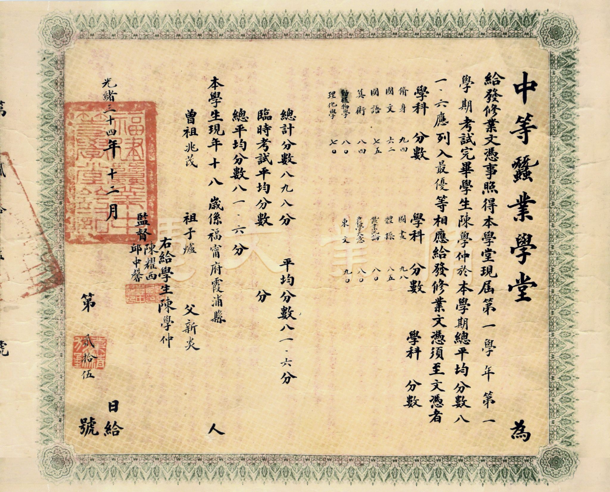 光绪三十四年(1908)中等蚕业学堂毕业证书