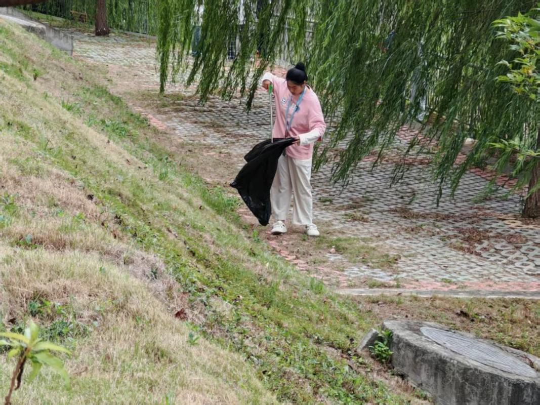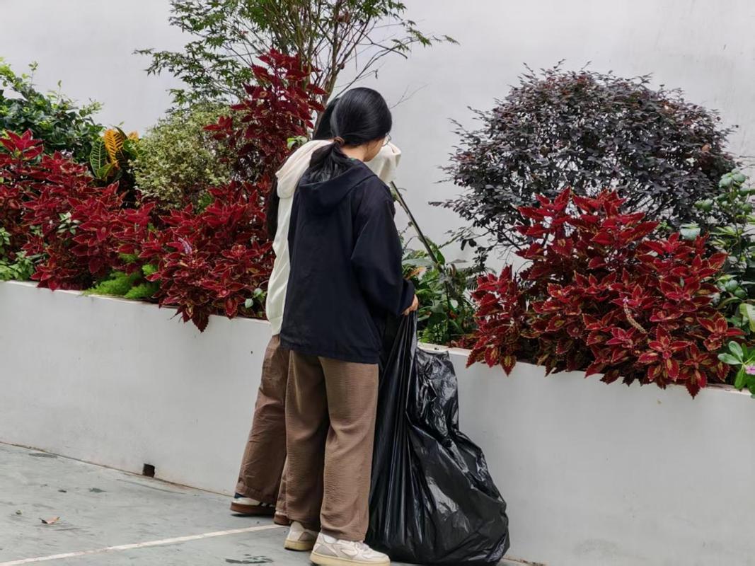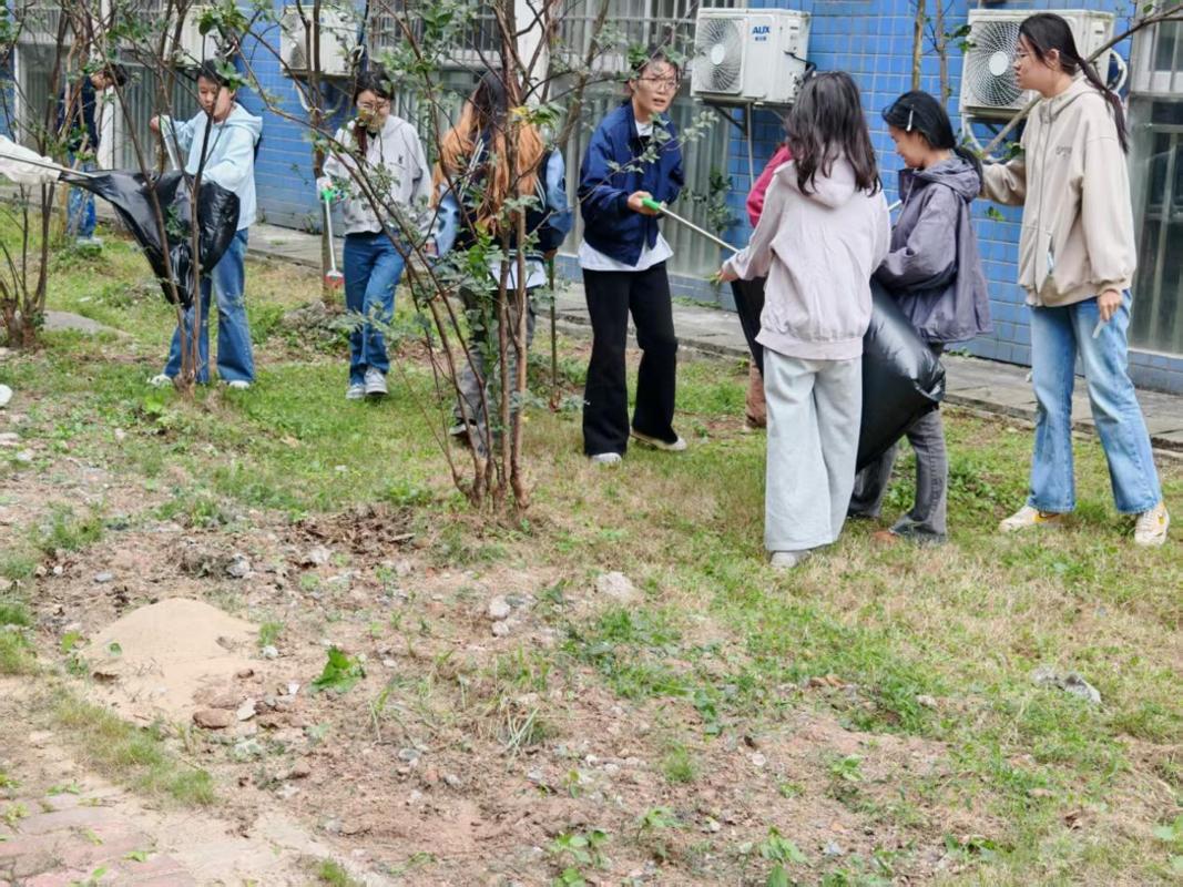活动期间,志愿者们在各小组队长的带领下,携带扫帚、垃圾袋、抹布等工具,分赴学生社区、学生宿舍九号楼后方、学院仓库及林荫大道等重点区域开展工作。现场分工明确、协作高效:有的志愿者手持扫帚清扫地面落叶与杂物,有的俯身细致捡拾草丛中的烟头、塑料瓶等垃圾,对卫生死角进行全面清理;部分负责绿植养护的志愿者还同步开展杂草拔除、枝叶修剪等工作,全方位改善校园环境面貌。在大家的共同努力下,原本散落着杂物的绿化带恢复了整洁,校园环境变得更加清爽雅致。