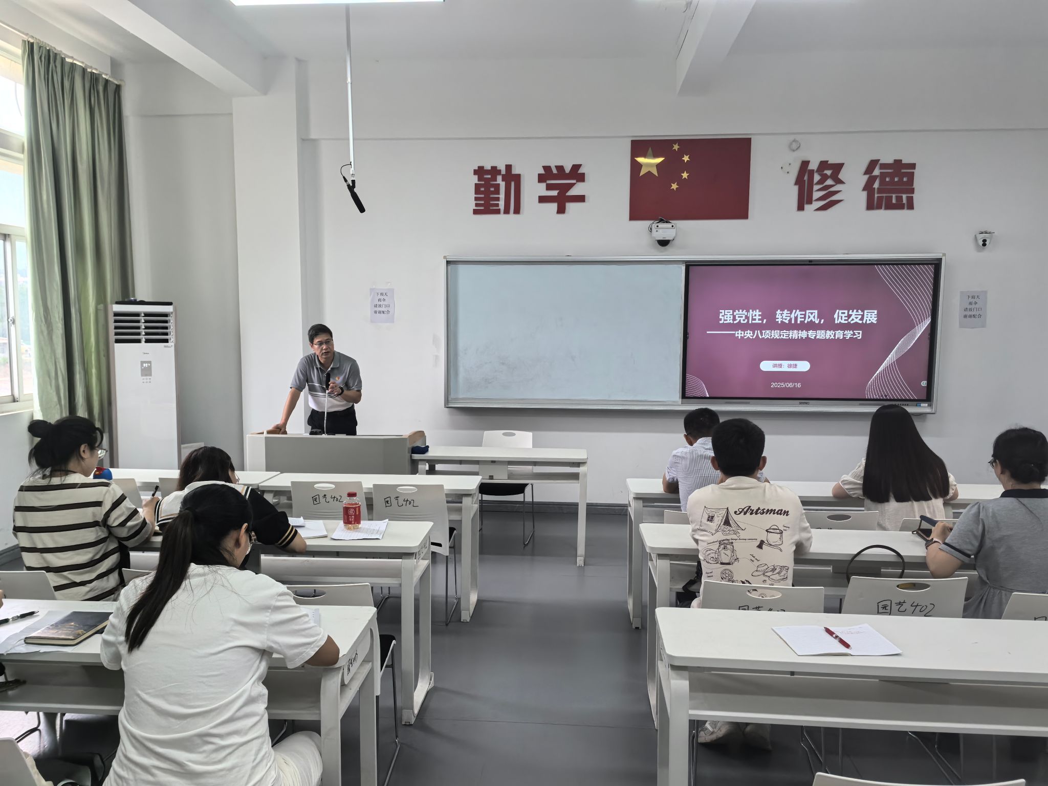 为持续巩固作风建设成效,筑牢辅导员队伍廉洁自律思想根基,6月16日下午,我院党总支书记徐捷在教学2号楼402教室,为全体专职辅导员讲授了题为“强党性 转作风 促发展”的专题党课。