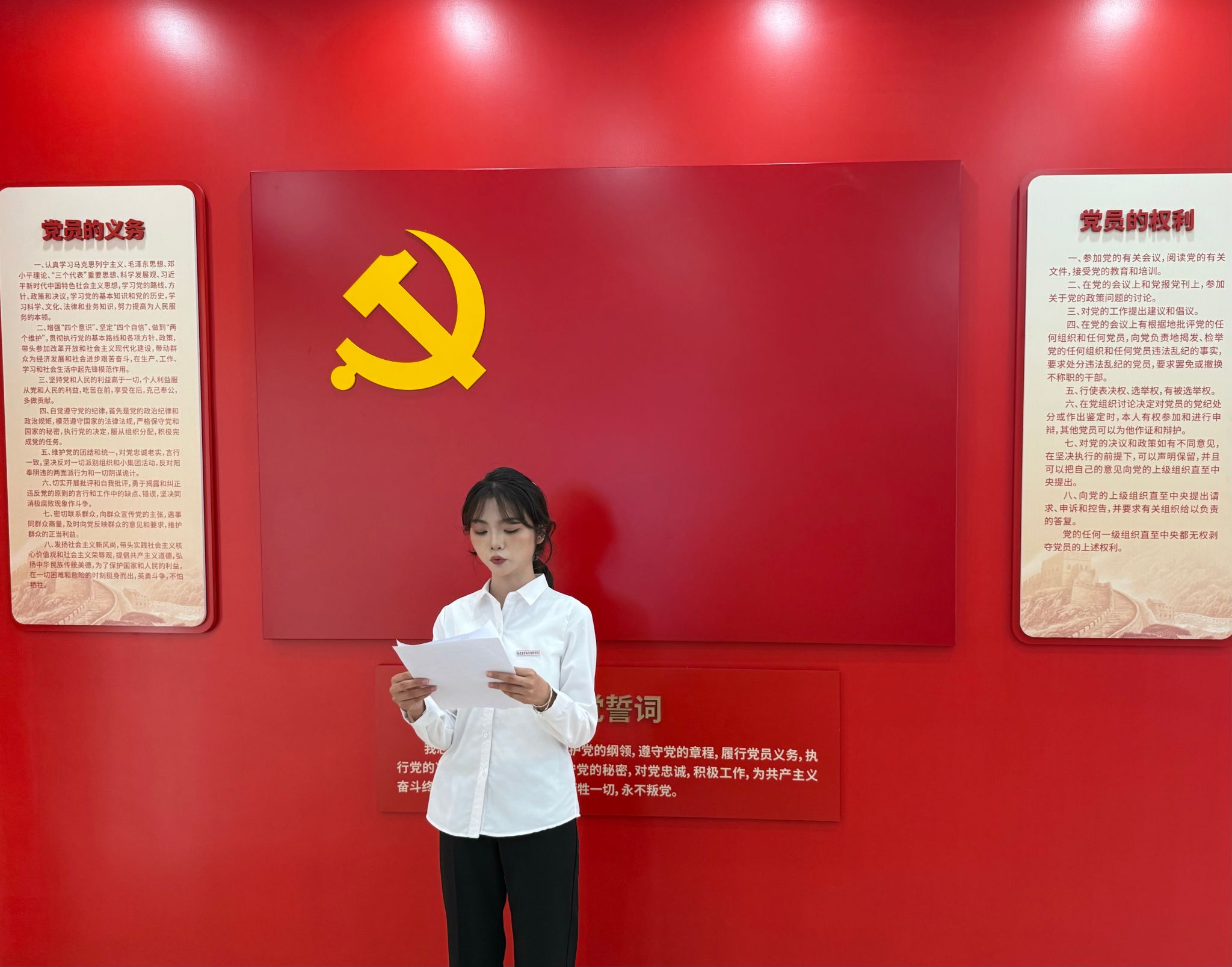 在学生第一党支部书记周俐的带领下,全体党员面向党旗庄严宣誓。“我志愿加入中国共产党……随时准备为党和人民牺牲一切,永不叛党。”的铿锵誓言回荡现场,党员们以字字千钧的承诺,彰显对党的忠诚与为共产主义事业奋斗的决心。