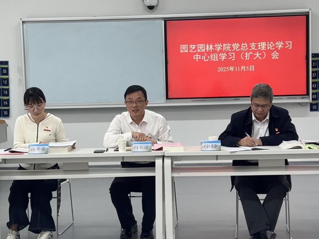 2025年11月5日下午,园艺园林学院在教学2号楼402教室召开党总支理论学习中心组学习(扩大)会议。院长何东进、党政办公室副主任兼宣传部(统战部)副部长陈翠蓉莅会指导,学院党总支书记徐捷主持会议,党总支理论学习中心组成员及部分教师代表参加学习。