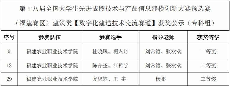 在近日结束的2025年第十八届全国大学生先进成图技术与产品信息建模创新大赛福建赛区预选赛中,我院学子在建筑类(数字化建造技术交流赛道)中荣获一等奖1项、二等奖1项、三等奖1项的优异成绩。