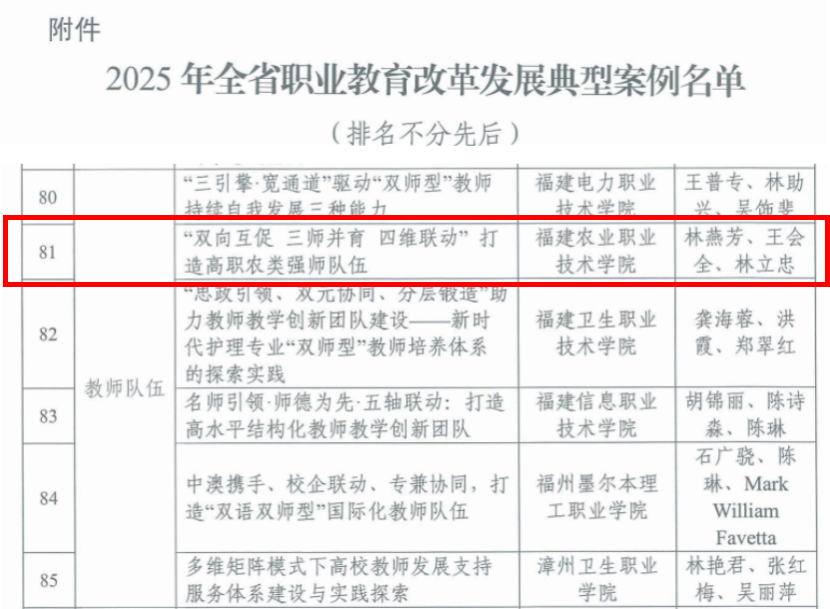 近日,福建省职业技术教育中心公布了2025年全省职业教育改革发展典型案例评选结果。由我院教师林燕芳作为负责人撰写的《“双向互促 三师并育 四维联动”打造高职农类强师队伍》案例成功入选。
