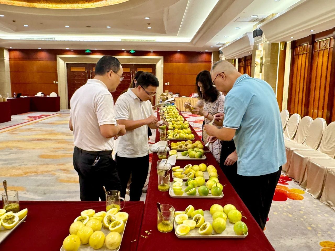 比赛现场,金都3号、钦蜜9号等多个百香果优良品种集中亮相,凭借饱满的果实形态与独特风味吸引关注。赛事评审环节邀请了福建省种植业技术推广总站、省农科院果树研究所、龙岩市农业农村局、宁德市农业农村局等单位的行业专家,我院王会全、刘美琴、徐磊、黄雪盈四位老师亦受邀参与鉴品工作,以专业视角为赛事评审提供支持。