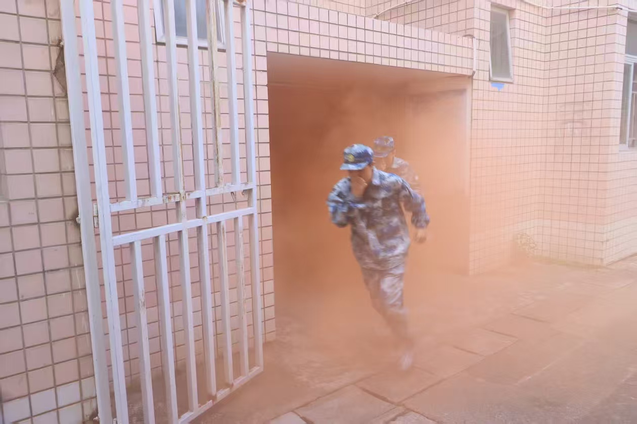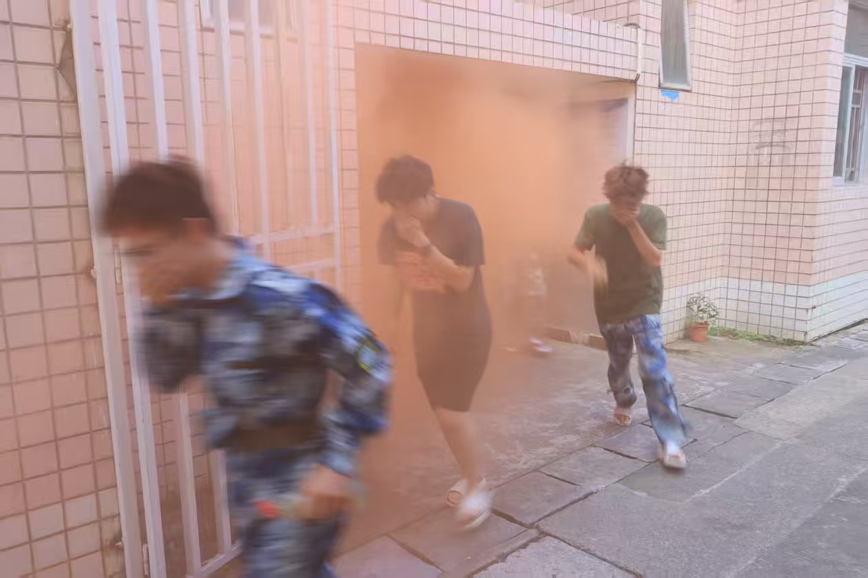 14时15分,尖锐的警报声骤然响起,5号楼宿舍的同学们迅速反应,第一时间停止手中事务,迅速蜷曲身体降低重心,捂住口鼻,严格遵循“右侧通行”原则,沿着预定疏散路线有序撤离宿舍楼,远离起火点,向着安全区域紧急疏散。