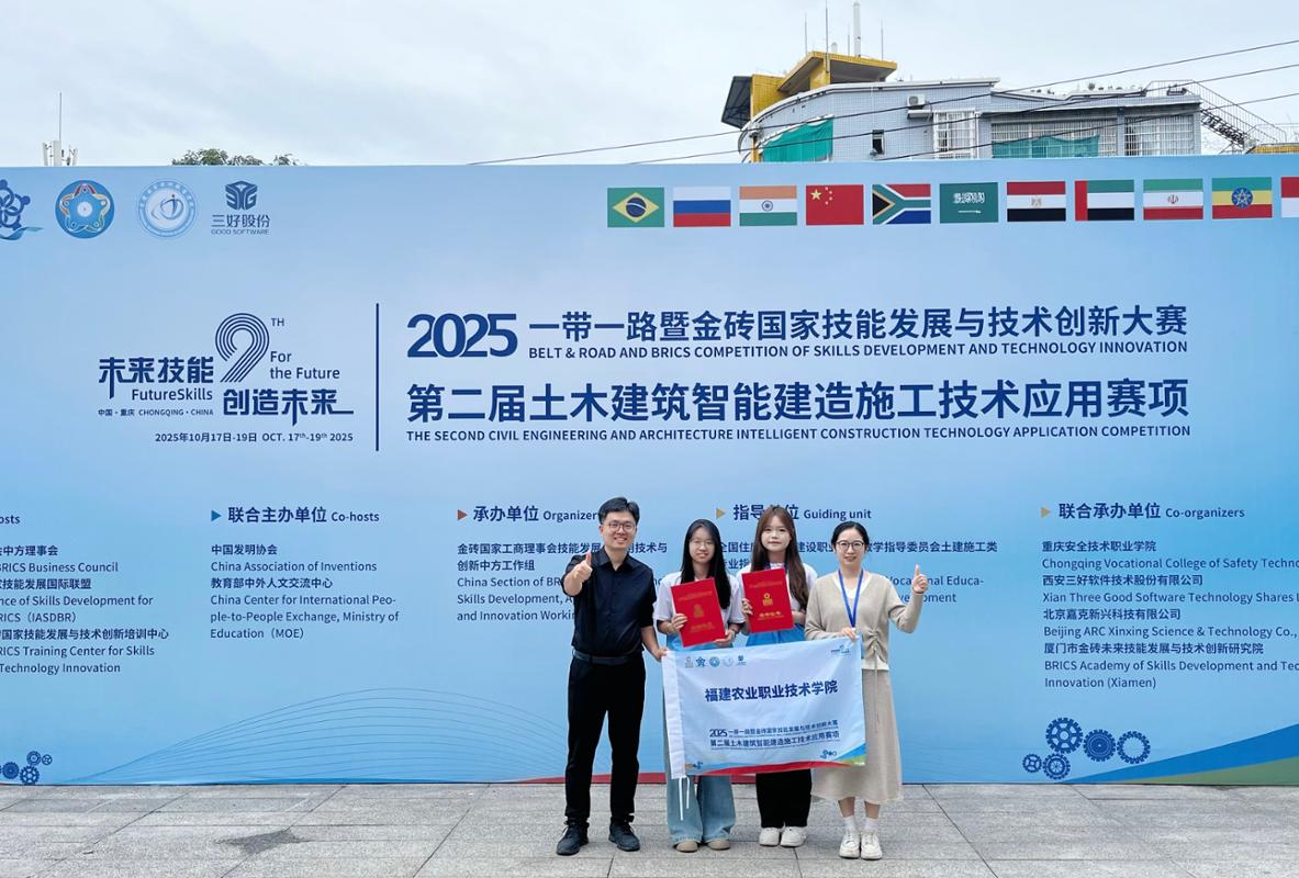 秋深三峡阔,技能展风采。10月17日至19日,2025“一带一路”暨金砖国家技能发展与技术创新大赛第二届土木建筑智能建造施工技术应用赛项全国总决赛在重庆安全技术职业学院落下帷幕。我院学子吴婧钰、刘巧泓在谢敏、张俊腾两位指导老师的带领下,凭借扎实的专业功底、娴熟的实操技能与稳定的临场发挥,从全国298支入围决赛的队伍中脱颖而出,成功斩获国赛二等奖,为学校赢得重要荣誉。同时,我院因出色的赛事组织协调能力,被授予“优秀组织单位”称号,实现“竞赛成绩突破 + 组织工作认可”的双重丰收。