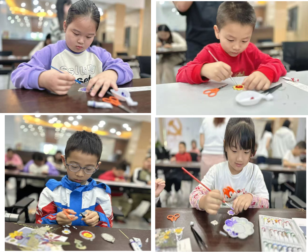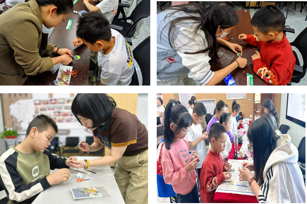 活动现场,暖意融融、创意涌动。园艺园林学院的专业老师首先以生动易懂的语言,向小朋友们介绍了压花传统文化,技艺制作原理以及植物的选择技巧,从花叶的搭配构图到滴胶的使用方法,从安全操作规范到成品保养要点,老师都耐心讲解、细致示范。学生党员和团员志愿者们则一对一、手把手地指导小朋友们进行创作,“这片银杏叶的弧度很特别,可以放在首饰的中心”“搭配一点紫色的小雏菊,颜色会更丰富哦”,志愿者们温柔的鼓励与专业的建议,让孩子们大胆释放想象力。