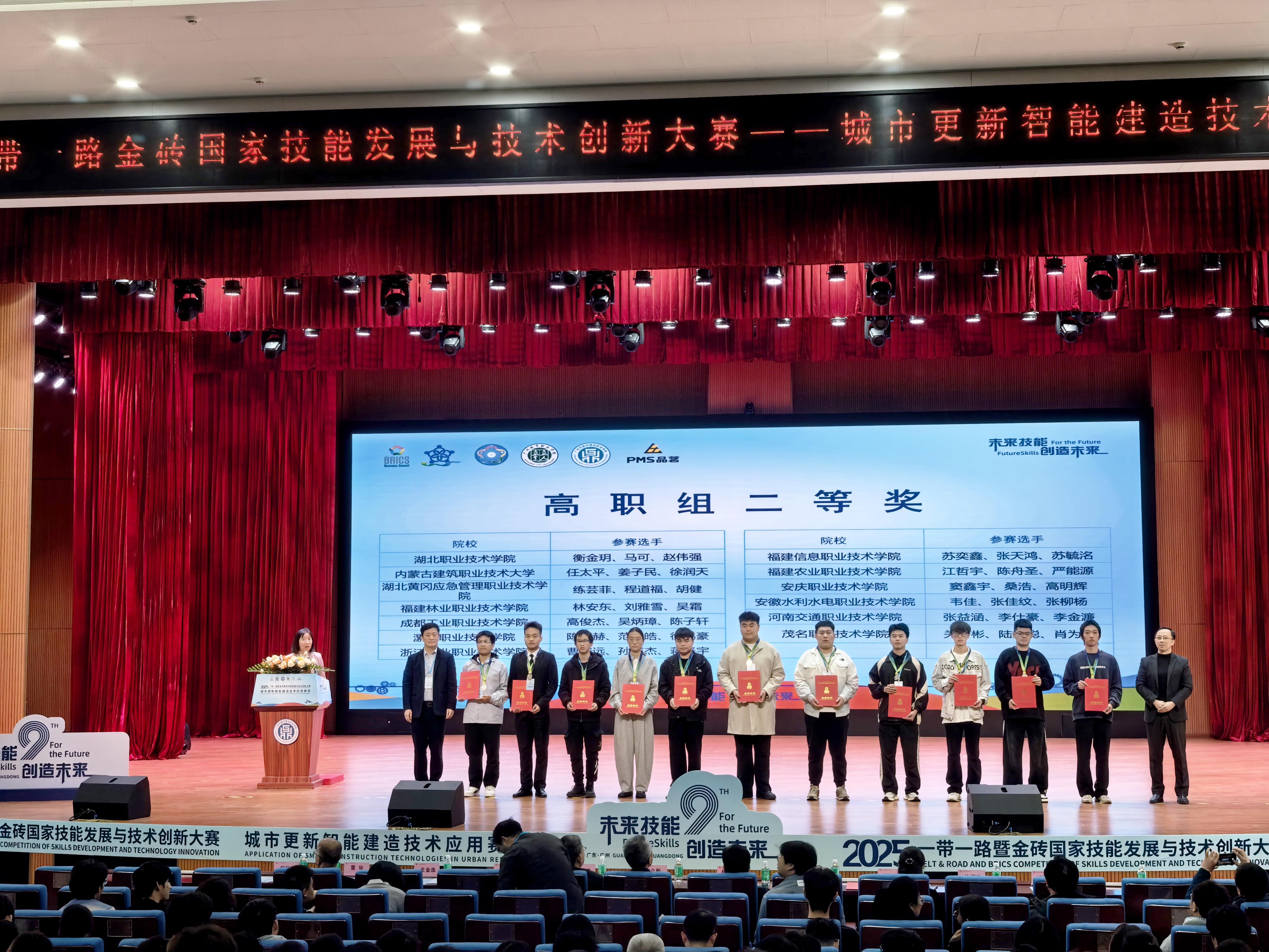 11月21日至23日,2025一带一路暨金砖国家技能发展与技术创新大赛“城市更新智能建造技术应用赛项”全国总决赛在广州城市职业学院圆满落幕。在学院统筹部署与精心组织下,由张俊腾、吴俊老师担任领队,张欢欢、刘常涛、谢敏、尤文贵等教师组成的指导团队,分别带领学生团队奋勇拼搏,最终在高职组竞赛中斩获全国二等奖、三等奖各 1 项,充分彰显了学院在智能建造领域的教学改革成效与高素质技能人才培养质量。