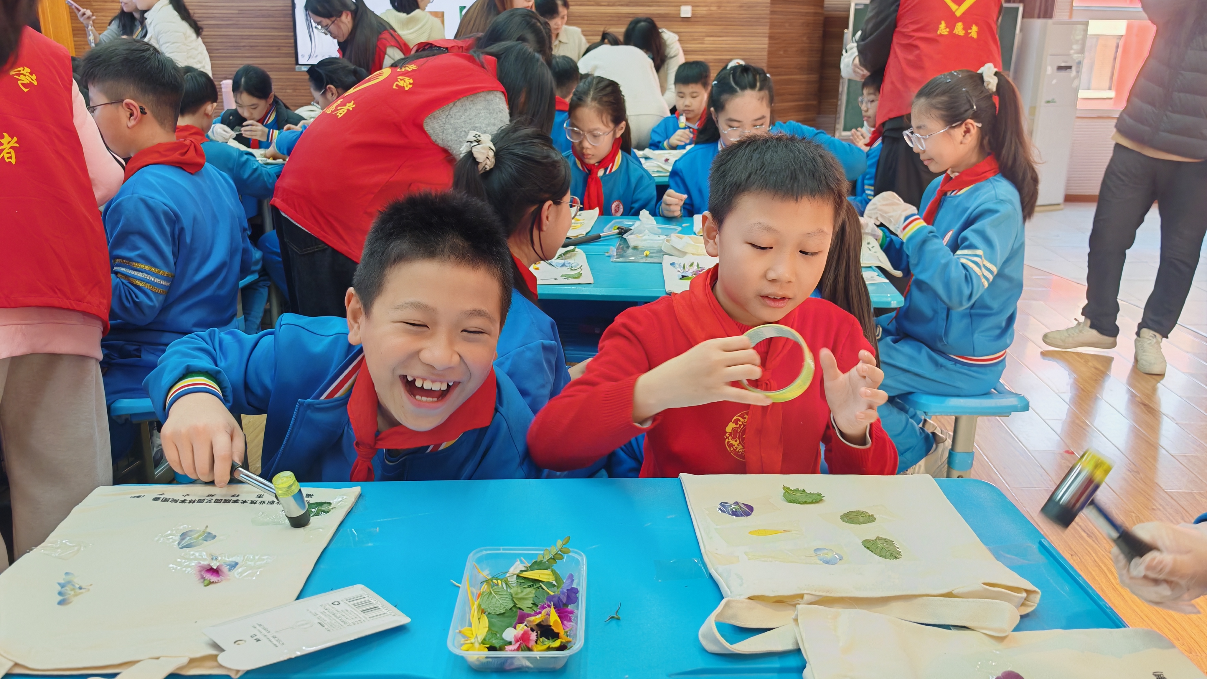 随后,在志愿者们的辅导下,小朋友们分组进行了动手拓印实践。现场准备了丰富的材料,包括帆布袋、胶带、锤子、儿童款安全剪刀、垫板等,确保每位小朋友都能安全、顺利地完成自己的拓印作品。活动中,孩子们充分发挥想象力和创造力,将一片片树叶、一朵朵花瓣巧妙地组合在帆布袋上,通过敲打、按压等方式,将植物的自然形态和色彩完美地呈现在作品上。作品完成后,小朋友们手持自己亲手制作的植物拓印作品,脸上洋溢着满足和自豪的笑容,纷纷与各自的作品合影留念。