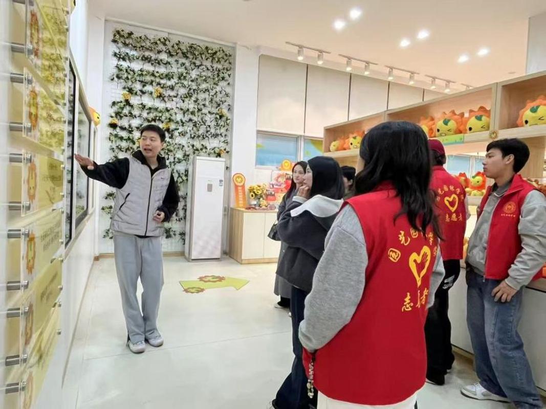 在福建师范大学团委蒋钦文老师的讲解下,骨干班成员依次参观了小葵馆各主题展区。展馆以“青春向党”为主线,通过图文展示、实物陈列、多媒体互动等形式,全面呈现了福师大共青团在思想引领、校园文化、社会实践、志愿服务等方面的特色做法与丰硕成果。在实践案例展区,大家认真学习“小葵”团队在乡村振兴、支教服务等工作中的创新模式与实践经验;谢老师重点分享了“小葵”IP品牌打造路径,为我院学生骨干培育、团学品牌建设提供了有益借鉴。