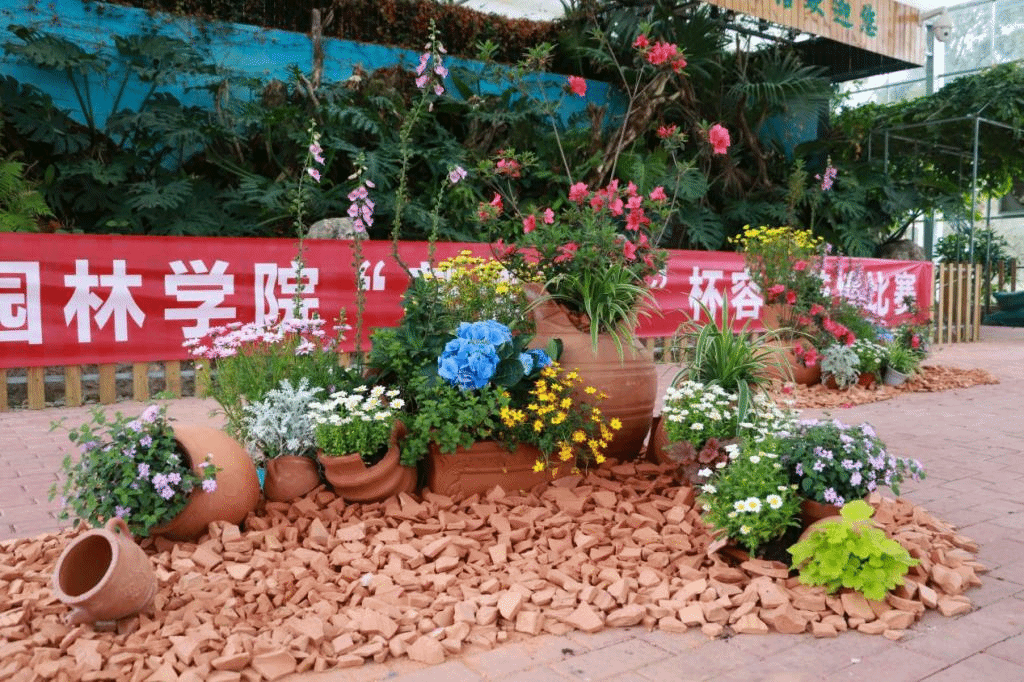此次比赛所用容器、辅材均为陶瓷工厂废弃陶罐,同学们应用所学专业知识,通过容器合理选择及植物灵活搭配,创新思维,变废为宝,制作出一个个赏心悦目的容器花境,每一个花境作品不仅传达着参赛选手的设计理念,还表达出了设计者积极乐观的生活态度。