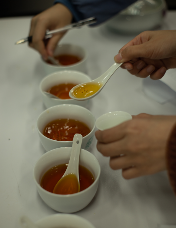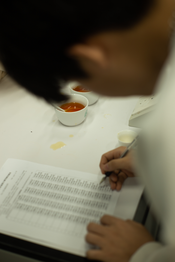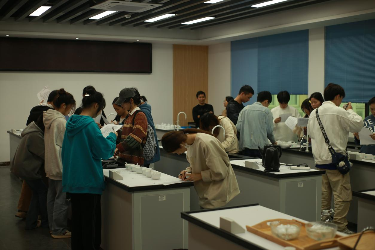 茶叶审评室中,同学们正在有序且专注地从香气,色泽,滋味的区别中辨别来自全国的12款红茶(包含了小种红茶,传统工夫红茶和新式工夫红茶),用自己的方式去记录每一款红茶的品质特征。