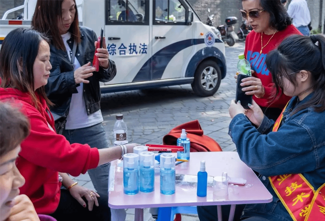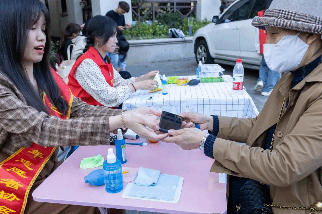 服务组的志愿者们开设了服务台,为过往的行人无偿清洁眼镜、手机。获得过往行人的一致好评,许多行人表示:当代大学生就应如此,赓续雷锋精神。