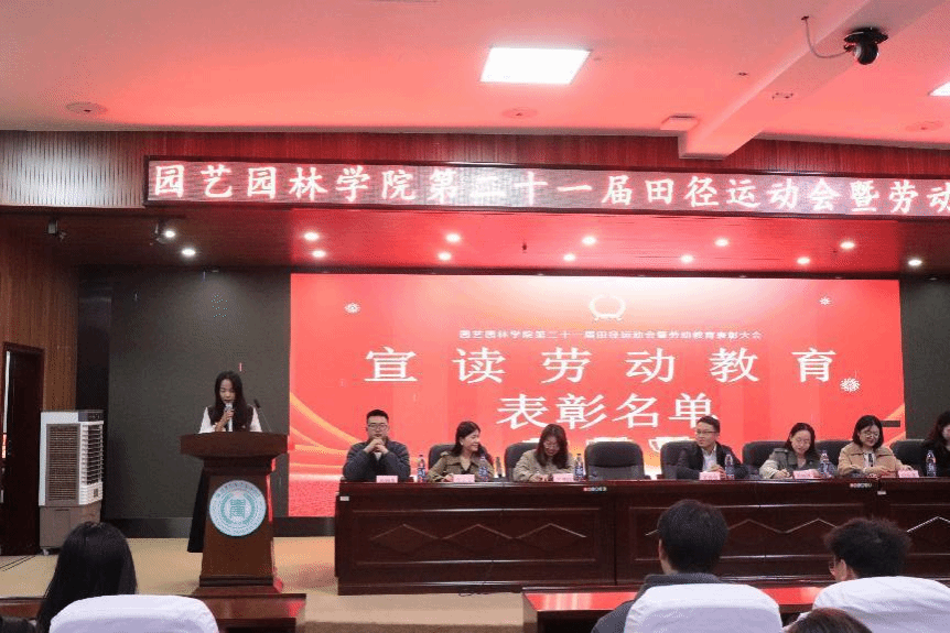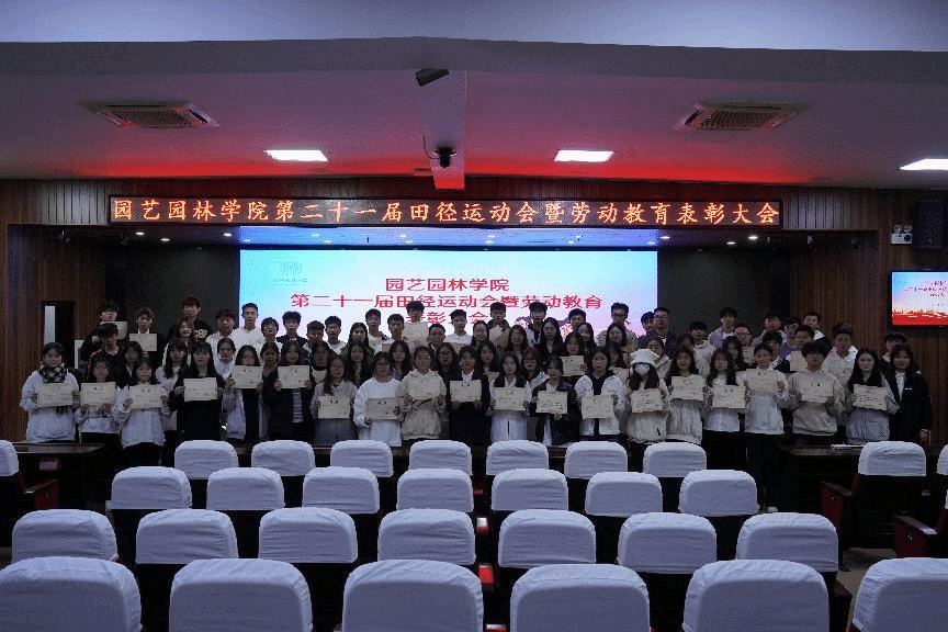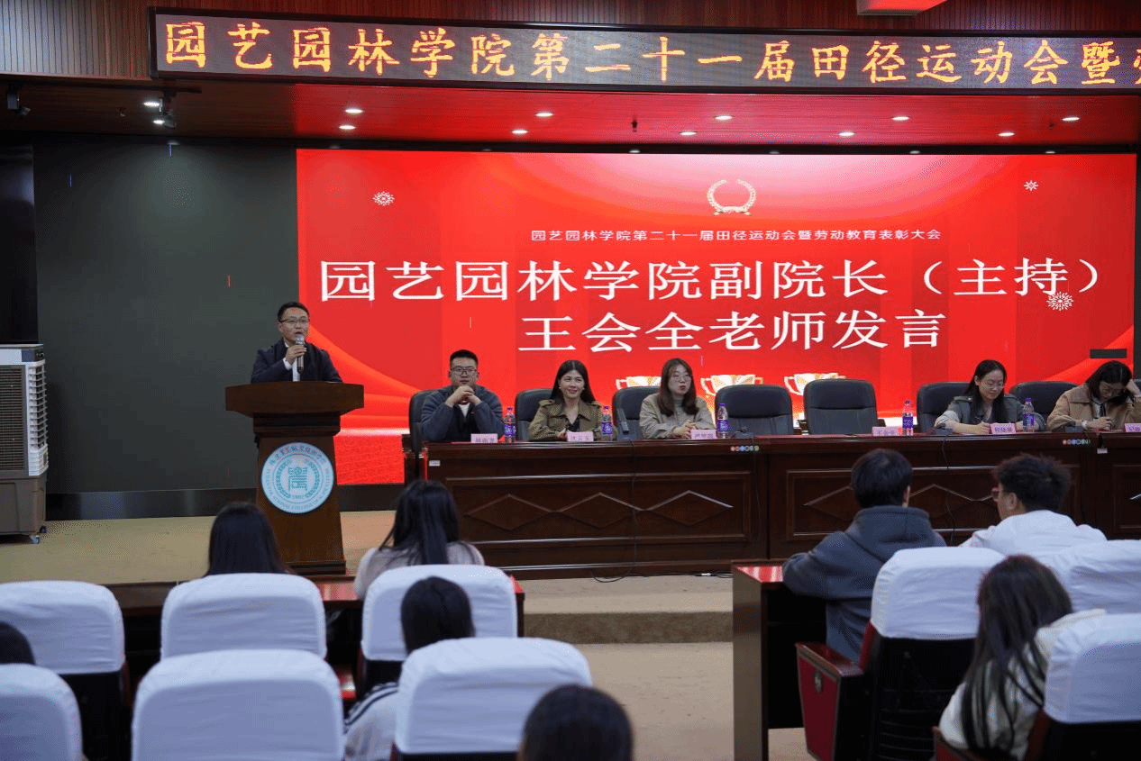 2023年11月21日晚,园艺园林学院第二十一届田径运动会暨劳动教育表彰大会于闽台楼二楼学术报告厅举行。园艺园林学院副院长(主持)王会全老师、程晓琳老师、团总支书记林雨龙老师、全体辅导员及运动员、鲜花队、入场式、团体操、宣传报道组、劳动教育组优秀代表与各班级学生代表参加会议。