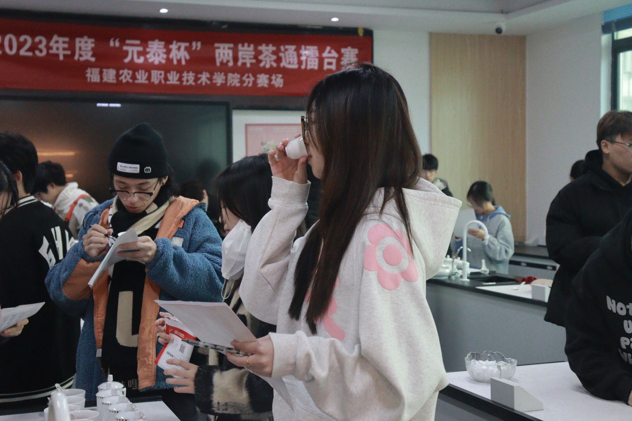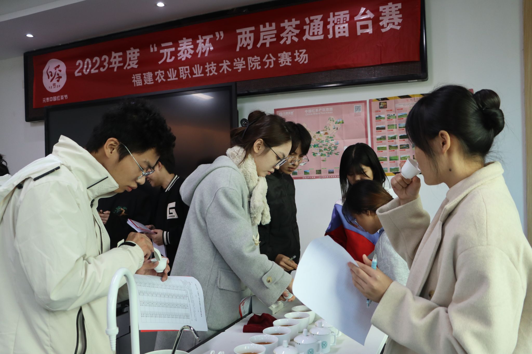 2023年12月24日下午,由福州市鼓楼区台港澳办、福州市鼓楼区总工会、福州市鼓楼区人力资源和社会保障局、福州市鼓楼区科协、武夷学院茶与食品学院主办,福州市励勤职业技能培训学校、福茶网、两岸大湾区红茶文化研究所承办的2023年度“元泰杯”两岸茶通擂台赛在我校实训楼(3)茶艺实训室成功举办。本届茶通擂台赛的茶样从全国各地征集的茶样中选取15款红茶,吸引了30多名茶艺专业的选手。本次比赛由园艺园林学院茶艺与茶文化专业陶湘辉老师担任指导,学生罗荣飞主持。