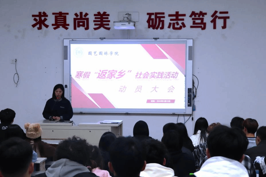 2024年1月15日晚,园艺园林学院团总支于教学楼(2)512教室举行2024年寒假“返家乡”社会实践动员大会。学院团总支书记林雨龙老师,学院团总支、学生分会全体干部及各班级班委参与本次大会。
