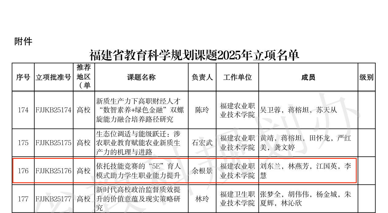 2025年11月19日,福建省教育科学规划2025年度课题立项名单正式公示,由余根景老师作为负责人,刘东兰、林燕芳、江国英、李慧等教师共同参与的《依托技能竞赛的“5E”育人模式助力学生职业能力提升》课题成功入选,标志着我院在职业教育育人模式创新研究领域获得省级认可。