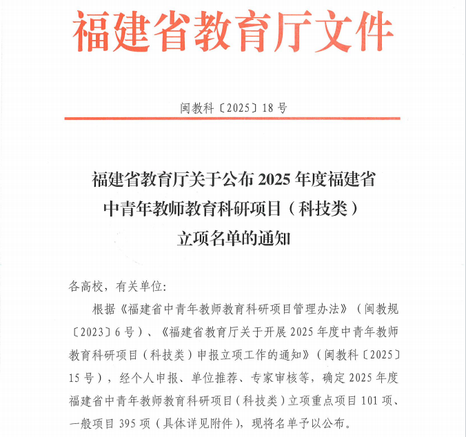 近日,福建省教育厅发布《福建省教育厅关于公布2025年度福建省中青年教师教育科研项目(科技类)立项名单的通知》(闽教科〔2025〕18号),我院教师申报的科研项目喜获丰收,共获批立项4项。其中,林蔚老师主持的项目获“重点项目”立项,谢敏、黄彦晶、赵越三位老师主持的项目获“一般项目”立项。