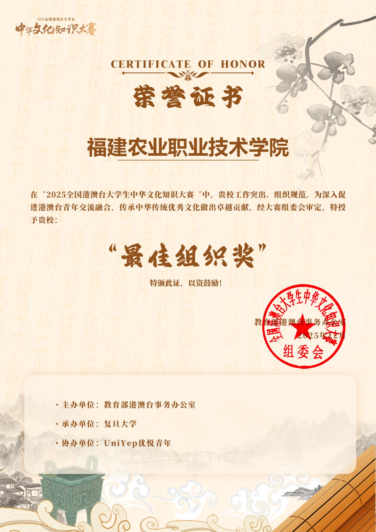 近日,由教育部港澳台事务办公室主办、复旦大学承办的2025年港澳台大学生中华文化知识大赛圆满落幕。由我院林雨龙老师指导,茶艺与茶文化专业戚灏萱、洪伟翔及园艺技术专业彭子芹三名学生组成的团队在赛事中充分展现扎实的文化功底与良好的精神风貌,与来自全国各地200余所本科高职院校的精英团队同台竞技、奋勇拼搏,最终获得“最佳组织奖”,林雨龙老师获得“优秀指导老师”。