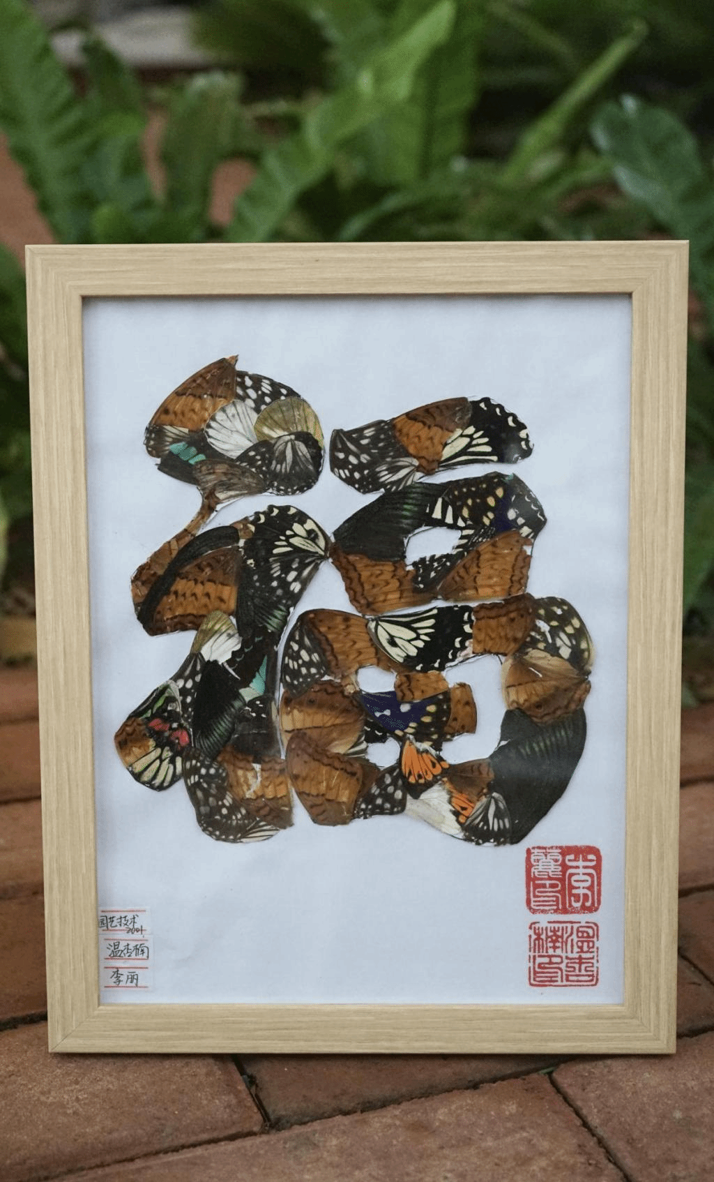 我院学生以创新的思维利用蝴蝶翅独特的花纹来展示昆虫世界之美。本次昆虫作品展作品以天然蝴蝶翅膀为材料,经回软、展翅、防蛀、防腐、干燥以及后期制作等十余道工序,以人物、动物、山水、花草、书法等形式呈现出来。蝶翅画创作展现了我校学生丰富的文化寓想。