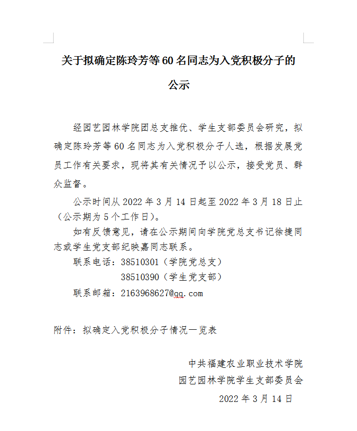 关于拟确定陈玲芳等60名同志为入党积极分子的公示