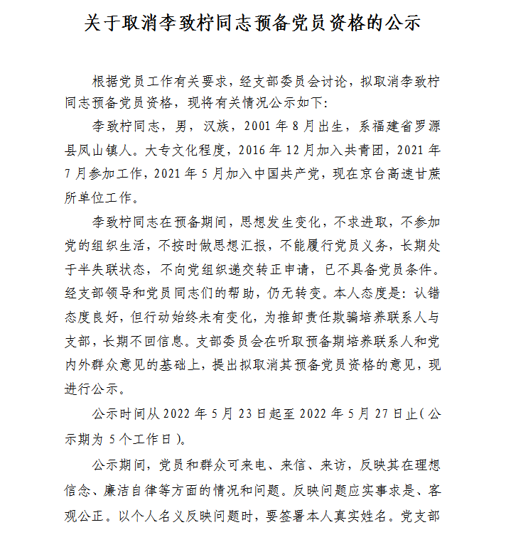 关于取消李致柠同志预备党员资格的公示