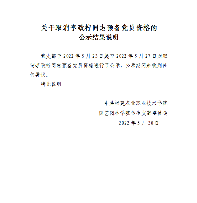 关于取消李致柠同志预备党员资格的公示结果说明