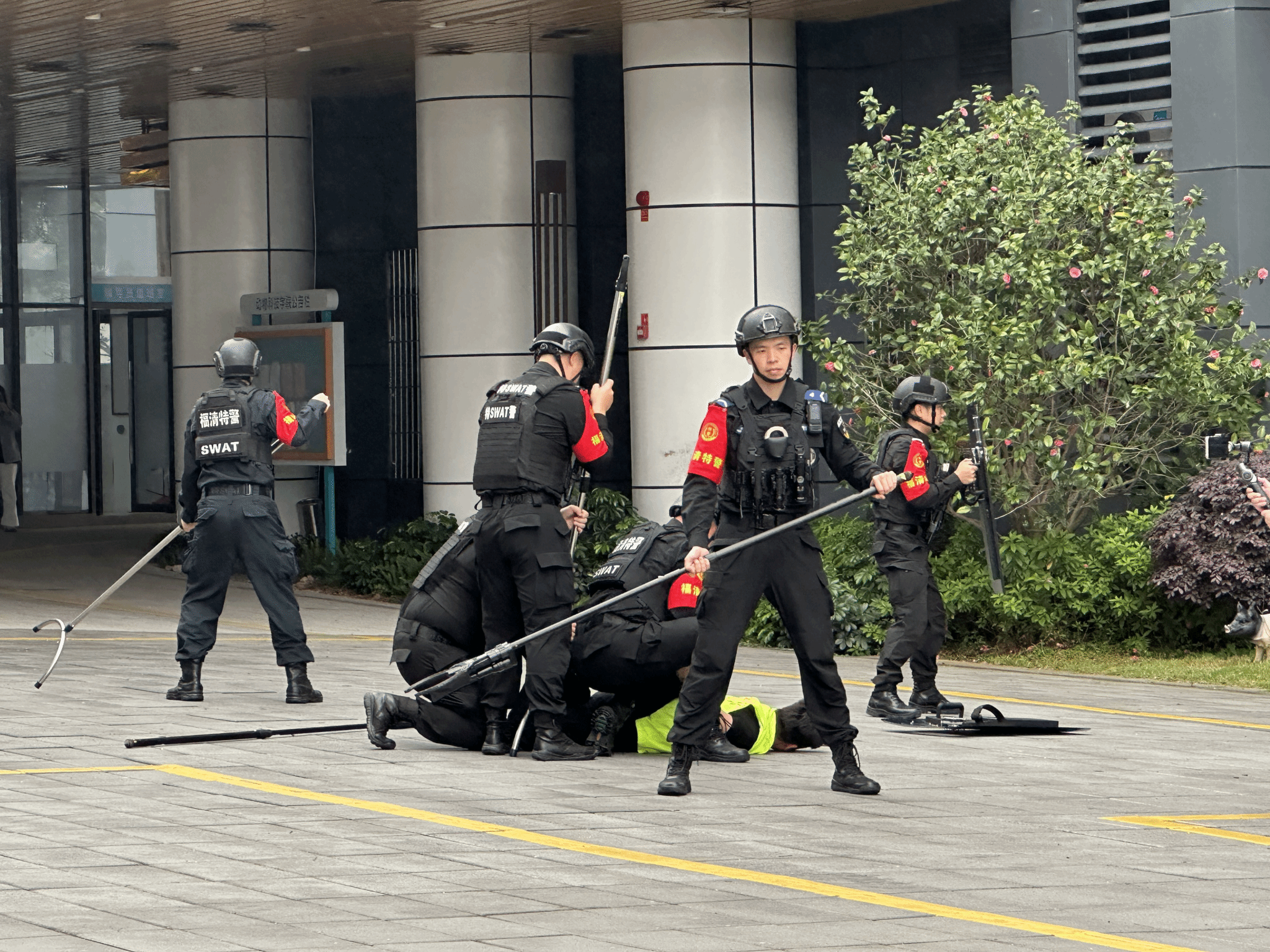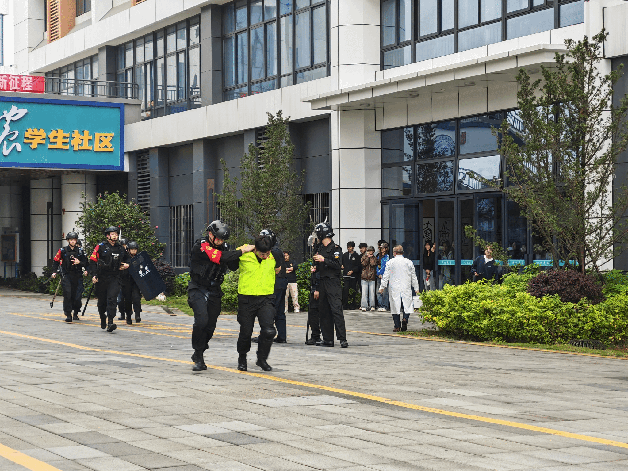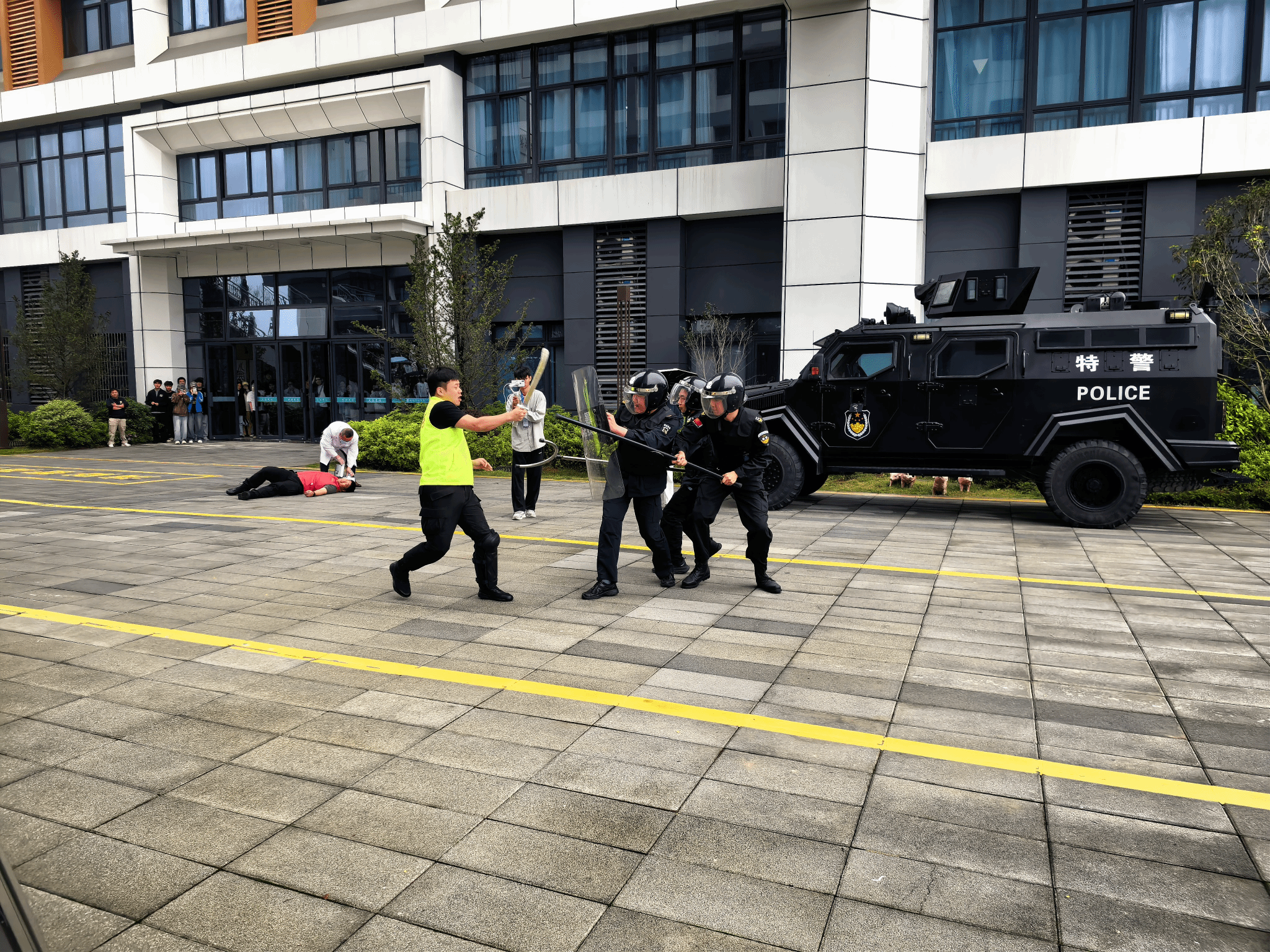 实战演练环节将活动推向高潮。巡特警反恐大队、镜洋派出所民警与学院工作人员协同配合,模拟校园突发事件场景,规范开展应急处置,直观展示处置流程,有效提升师生避险能力。