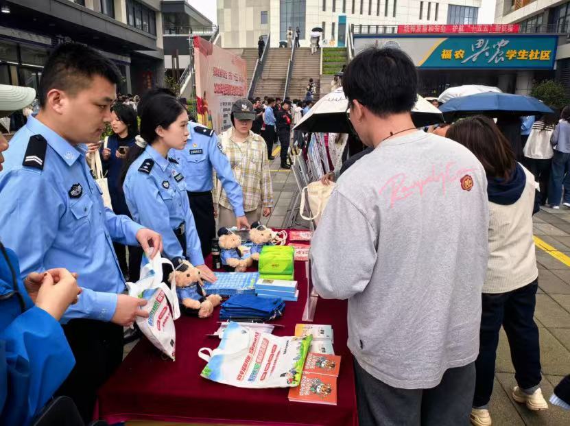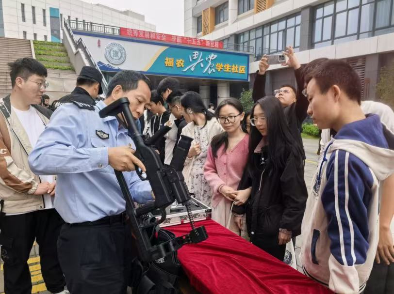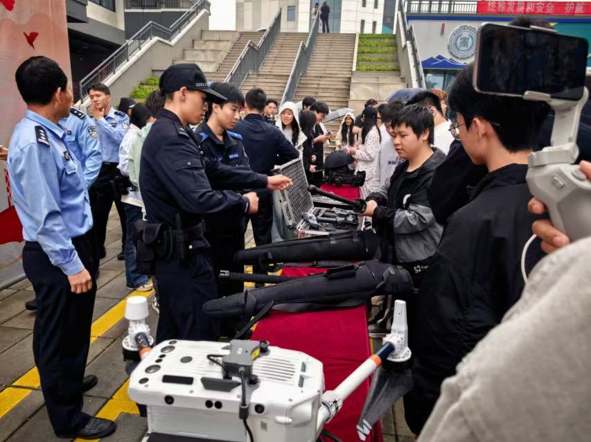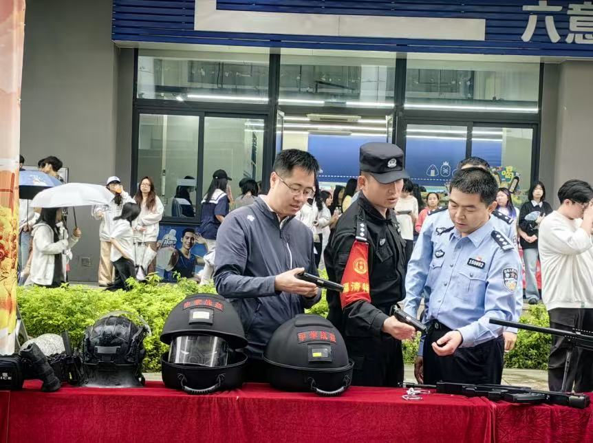 在警用装备展示区,一线警用装备、枪械、警用无人机等集中亮相,特警队员现场讲解装备功能与实战应用,让师生近距离感受科技强警成果,现场还发放了国家安全宣传品。