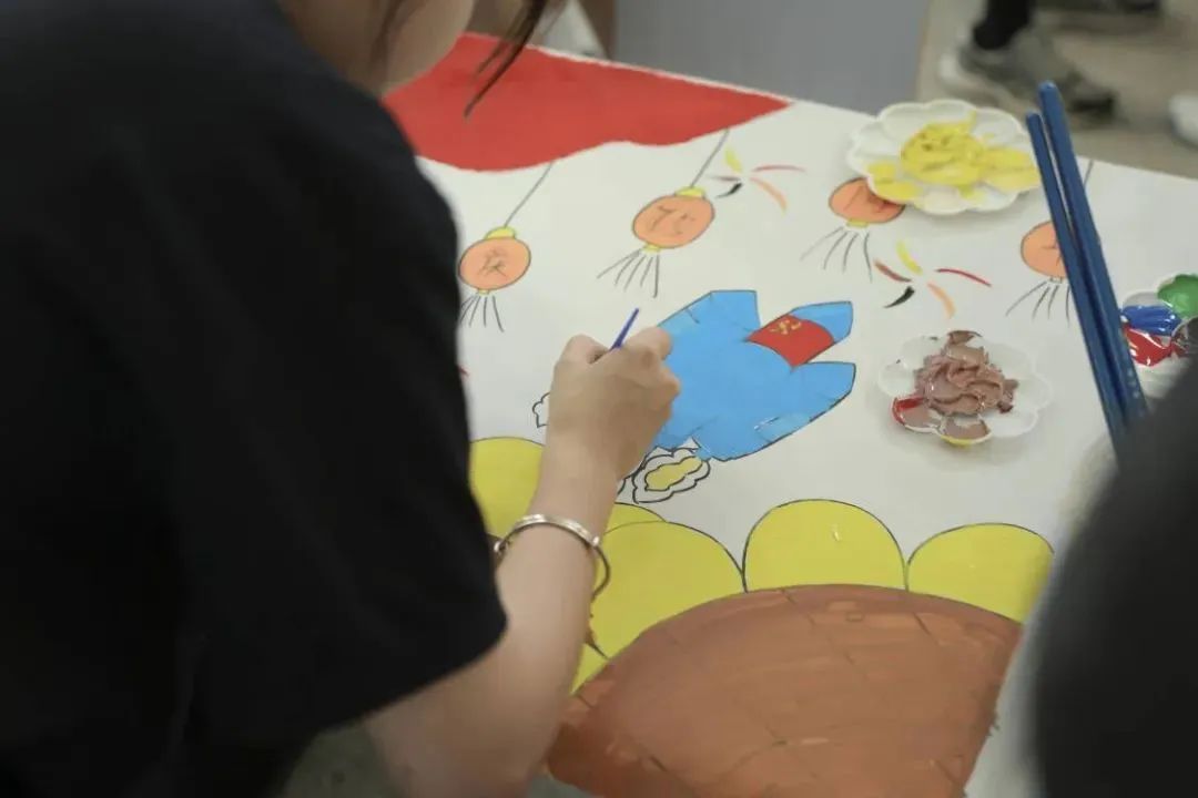 初稿敲定,线稿上色,细化……庆祝祖国华诞的热情在笔尖流淌。随着画笔的跳动,鲜活的色彩在画布上逐渐呈现,同学们对祖国的热爱纷纷跃然在10米画卷上。