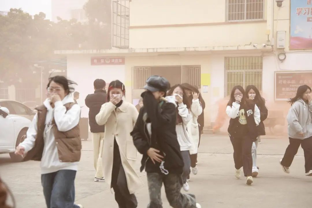 随着尖锐的火警警报骤然响起,演练正式拉开帷幕。全体师生迅速响应,各司其职。同学们严格按照演练要求,用手帕或湿毛巾捂住口鼻,低姿弯腰,沿着预定的疏散路线,迅速且有序地撤离至操场安全区域。