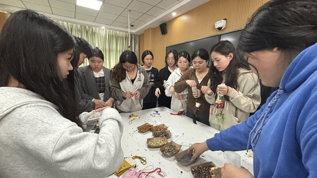 活动现场设置香囊制作体验区,艾叶、薰衣草、合欢花、檀香、茉莉花、郁金、夜交藤等天然香料散发宜人香气,让参与者感受到传统助眠方法的魅力。主持人逐一介绍每种香料的功效,并演示香囊制作方式,之后,同学们在舒缓的音乐中开启了自制香囊之旅,现场氛围轻松愉悦,充满欢声笑语。其中一位同学表示:“第一次亲手制作香囊,了解到它助眠的原理,很新奇也很实用。”