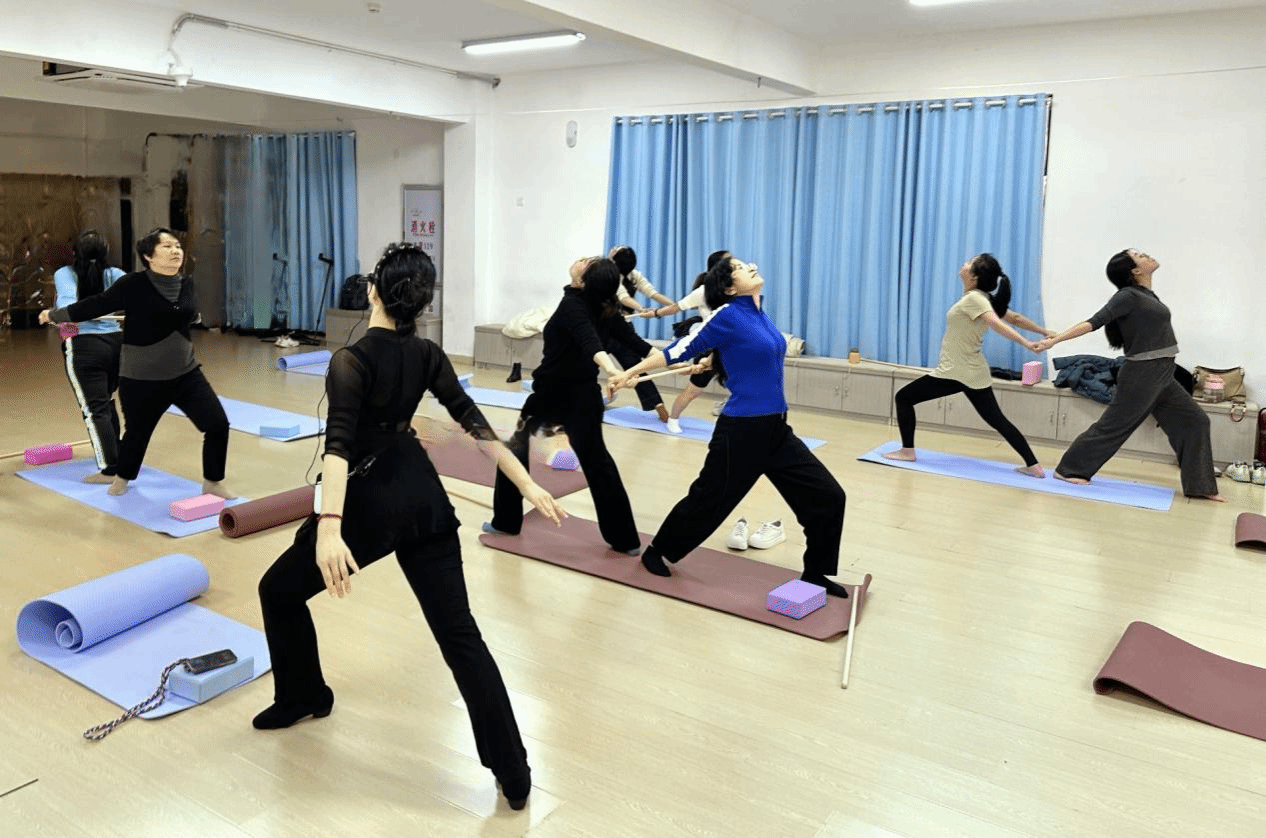 为增强活动趣味性,现场增设互动环节。参与者两两分组,借助辅助工具完成协作训练,并在音乐律动中学习形体热舞。李巧燕老师全程示范指导,及时纠正动作细节,确保训练效果。