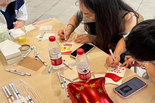 现场设置了祈福心愿墙,同学们在便签上书写对祖国美好的祝福,将其粘贴在充满希望的心愿墙上,勾勒出祖国的秀丽山河,贴满便签的心愿墙承载着同学们对祖国深深的厚爱、对祖国未来的期许。