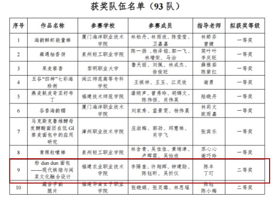 为促进职业院校交流,培养学生的创新精神和创业意识,提高实践能力、专业技能水平,由福建省食品加工与贮藏工程学会主办“友臣杯”第五届福建省职业教育食品创新创意大赛于2024年9月起全面展开。大赛以“创制低 GI,共享慢生活”为主题,鼓励参赛队伍运用相关专业知识,开发设计出有创意的低 GI 产品。本次大赛共征集了93项参赛作品,现代农业技术学院共有三项作品脱颖而出,《粉 dun dun 面包——现代烘焙与闽菜文化融合设计》、《...