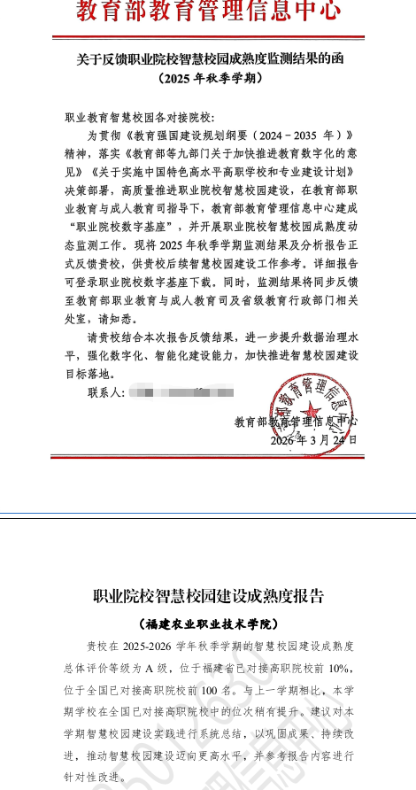 近日,教育部教育管理信息中心正式发布2025-2026学年秋季学期职业院校智慧校园建设成熟度监测结果,我院凭借扎实的数字化建设基础、突出的应用成效,在全国数千所参评职业院校中脱颖而出,智慧校园建设成熟度获评A级(最高等级),跻身全国已对接高职院校前100名。职业院校智慧校园成熟度监测是教育部落实职业教育数字化转型战略、规范职业院校数字校园建设的重要权威举措,依托全国“职业院校数字基座”(职教大脑)开展,监测覆盖办学治校32个关键应用场景,...