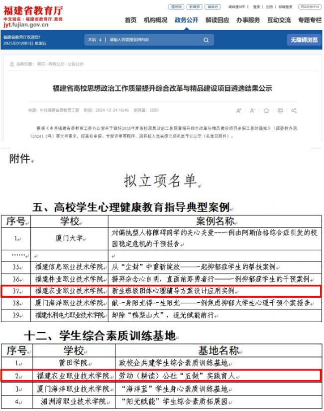 近日,中共福建省委教育工委公示福建省高校思想政治工作质量提升综合改革与精品建设项目遴选结果,我院申报的《新生班级团体心理辅导方案设计应用实例》入选高校学生心理健康教育指导典型案例,《劳动(耕读)公社“五做”实践育人》项目入选学生综合素质训练基地,2个项目入选标志着我院思想政治教育工作取得新突破。2025年,学院将继续深入挖掘思政工作中可示范、可辐射的先进经验和典型做法,扎实推进精品项目实施,持续完善优化项目建设,...
