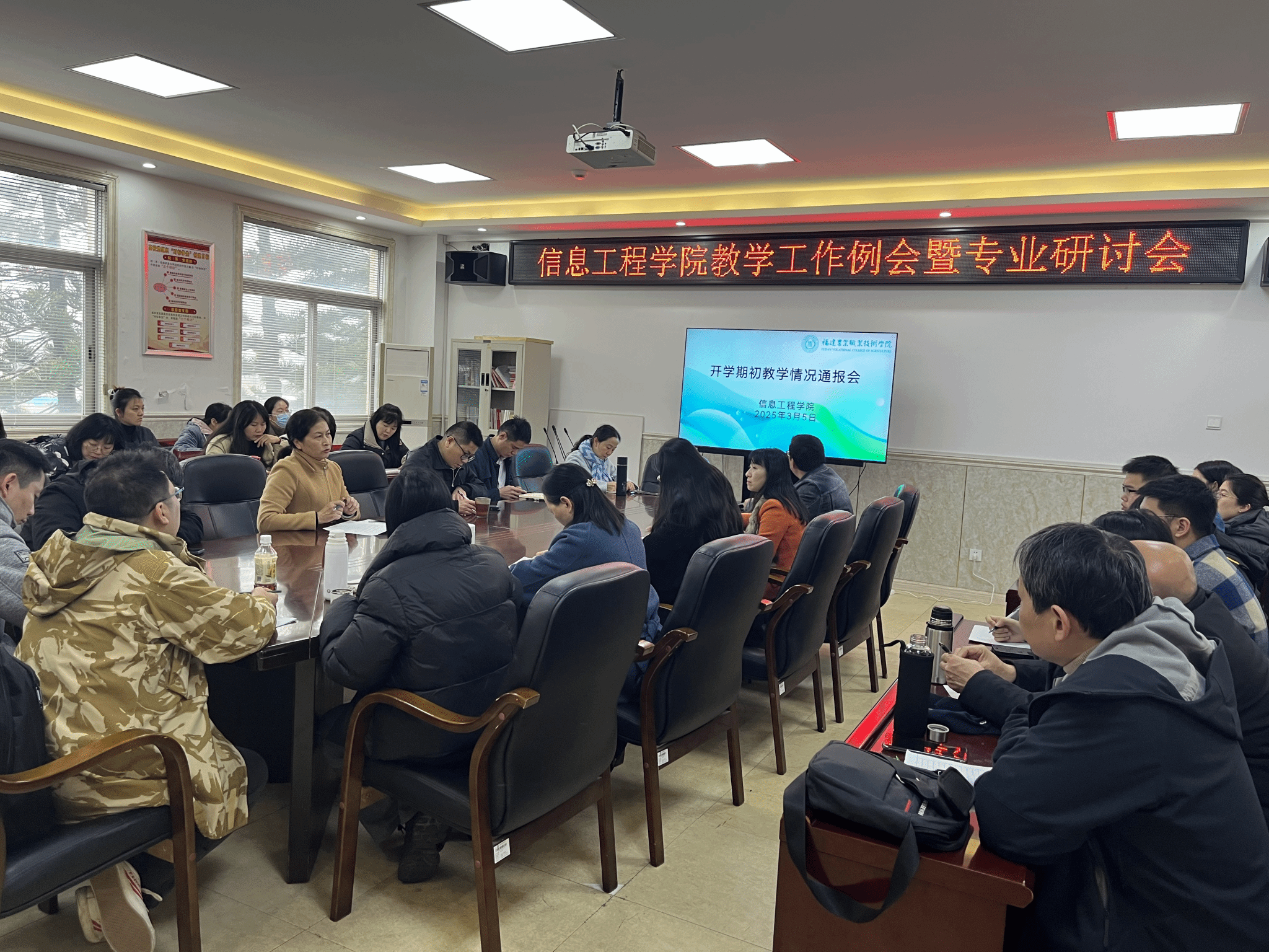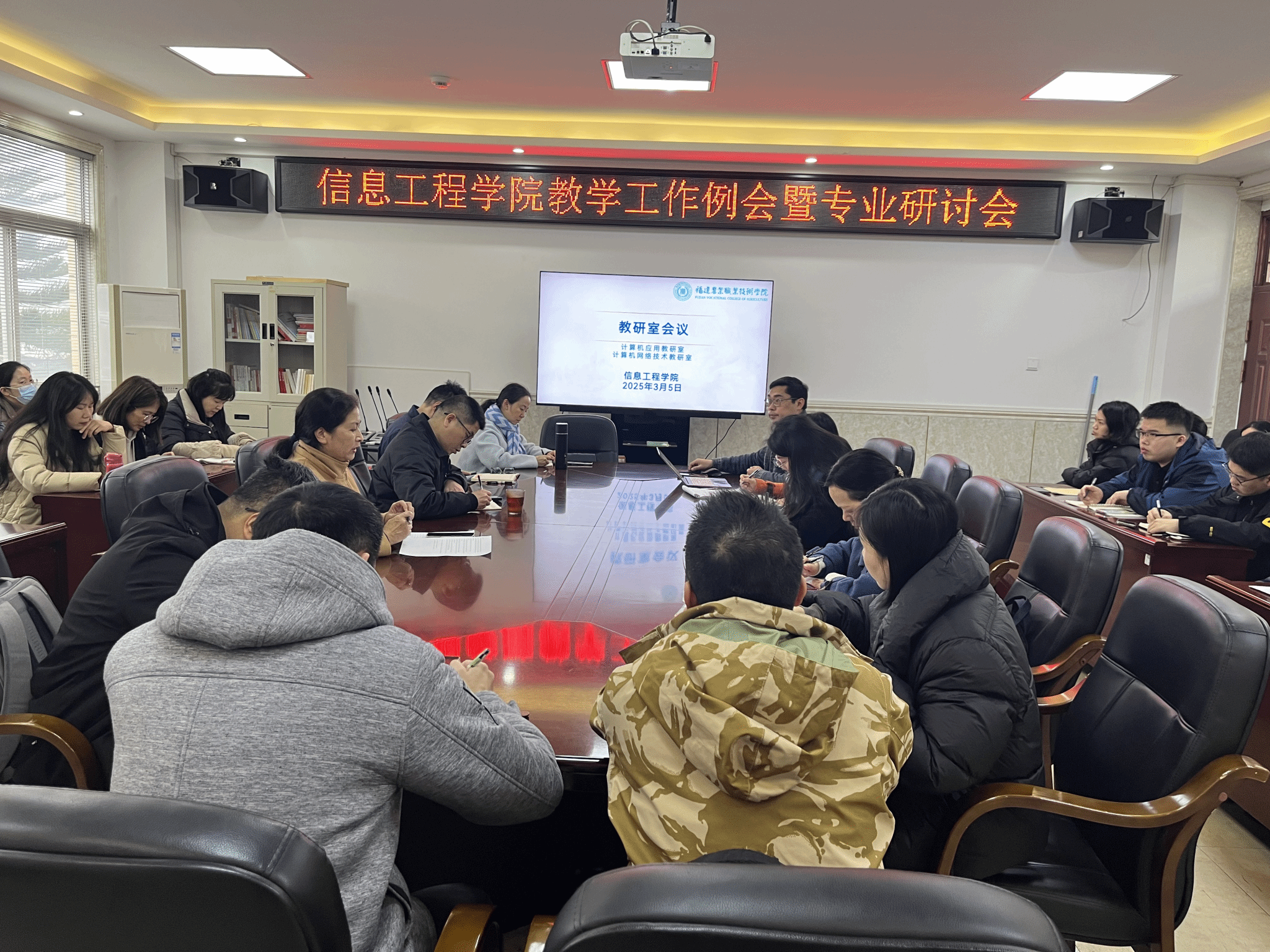 2025年3月5日下午,信息工程学院在教学楼会议室407开展期初教研室会议,讨论交流期初的教学情况、岗位实习、毕业论文收集等内容,会议由计应教研室主任张洁主持,计算机应用和计算机网教研室全体教师参会。