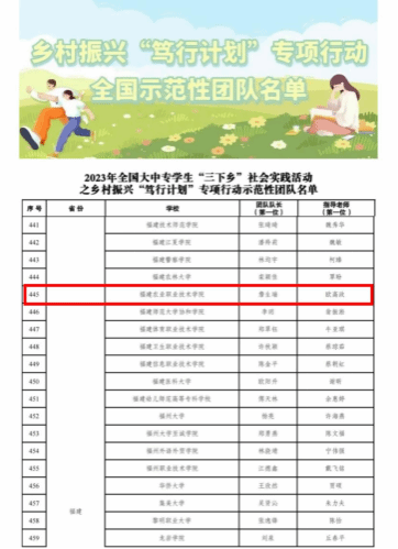 近日,由共青团中央青年发展部在全国范围内组织开展的2023年全国大中专学生“三下乡”社会实践活动之乡村振兴“笃行计划”专项行动发布了全国示范性团队名单。经学生自愿报名、学校团委推荐、省级团委遴选、团中央青年发展部审核,最终选出1000支全国性示范实践团队。我院“‘寻脉传统,赋能杨源’乡村振兴实践团”积极参与并成功入选。