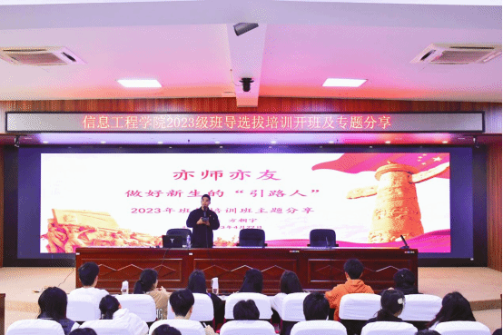 为加强朋辈教育,进一步提高班导生思想政治水平和管理服务能力,实现“先培训,后上岗”的准入制2023年4月22日上午8:30,信息工程学院2023级班导培训班在闽台楼二楼学术报告厅开班。